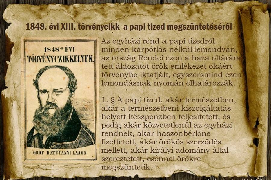 Az 1848 március 17-én miniszterelnöki hivatalba lépő Battyányi első lépése, hogy rögtön másnap, március 18-án elfogadják az úrbéres szolgáltatások azonnali megszüntetéséről és az egyházi tized eltörléséről szóló törvényjavaslatokat. (2)